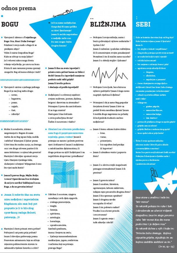 * Jesam li redovito išao na svetu misu nedjeljom i zapovjednim blagdanom,; ako sam koji put propustio, je li to bilo zbog opravdanog razloga (bolesti, putovanja…)?